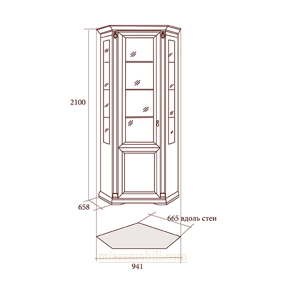 Шкаф оборудован светильником, задняя стенка зеркальная. Стеклянная дверь с фацетом установлена на карточные петли и оснащена металлической цепочкой, фиксирующей угол открывания.