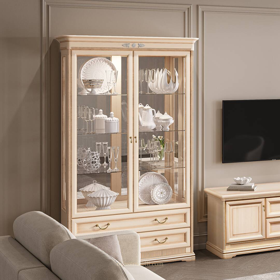 Фасад витрины декорирован накладными элементами. Высококачественная фурнитура обеспечивает долгий срок эксплуатации.