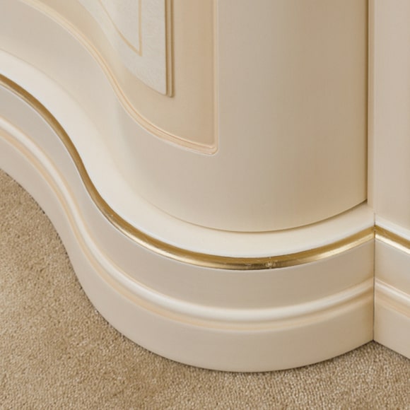 Шкаф имеет три отделения. Слева и справа установлено по четыре полки для хранения белья, по желанию возможна установка полки со штангой. Центральное отделение шкафа оборудована вкладной тумбой. Выдвижные ящики тумбы оснащены системой доводчиков. В верхней части шкафа установлена полка со штангой для хранения верхней одежды.Двери оборудованы системой плавного закрывания (доводки).